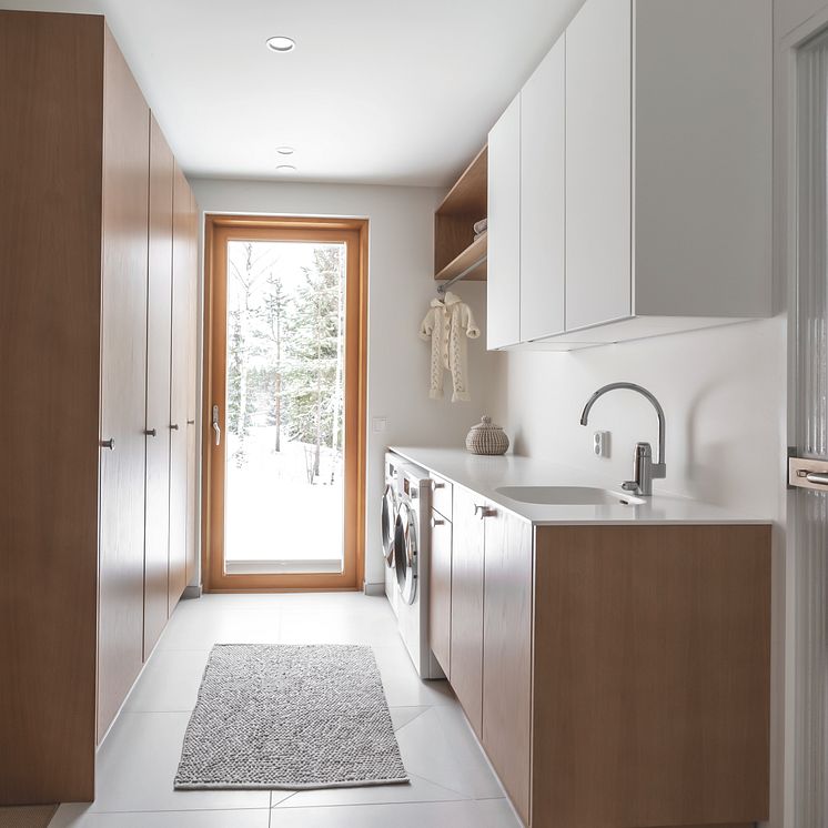 Tvättstuga är dels möblerad med samma serie som köket, dvs en Classic-lucka. Till denna har man valt att kombinera en vit PerfectSense-lucka, som för övrigt går att erhålla i totalt 11 kulörer.