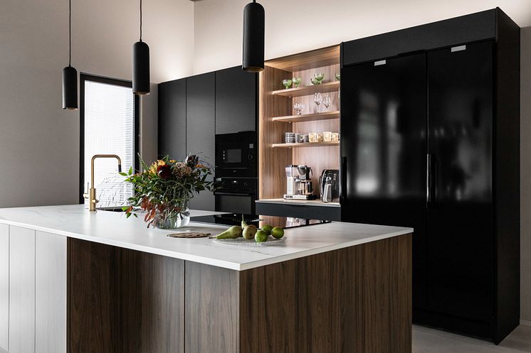 De svarta skåpen i kombination med valnöt blir en mix av strikt, stram elegans och mjuka naturtoner. Ett kök som kombinerar öppna skåp klädd insida tillsammans med de svarta Variant-luckorna. Köksön kombinerar matlagningsyta med mingelmöjlighet och blir en lyxig centerpiece klädd i valnöt och keramikskiva, i utförandet Rem Velvet.