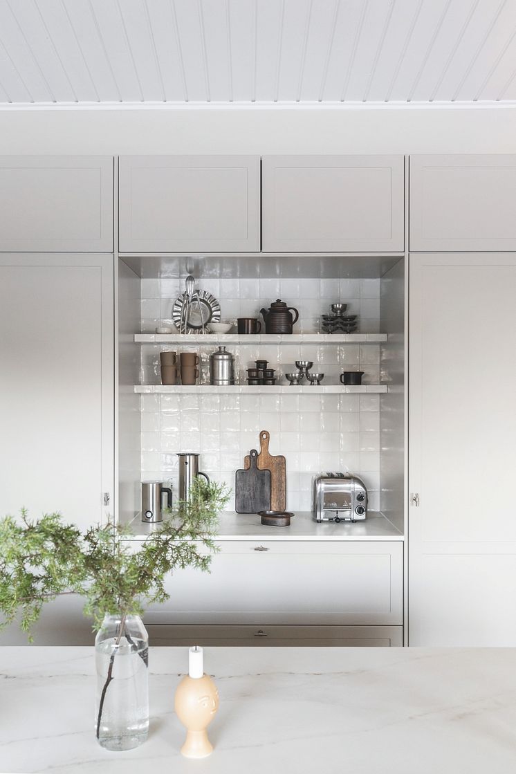 Puustellis sortiment är brett och erbjuder varierade stilar. Önskar man skapa en känsla av nostalgi och igenkänning? Med spegelluckor, renoverad bakugn och stort vitrinskåp förstärks intrycket. Köket är inrett med Bravura-luckan som i detta fall har färgen Dune, men som i övrigt finns i 16 färgställningar samt även som vitrinramlucka. Den ljusa känslan i köket förstärks ytterligare av den generösa köksön i keramik, Rem Velvet. Ett kök som inbjuder till samvaro och matlagning.