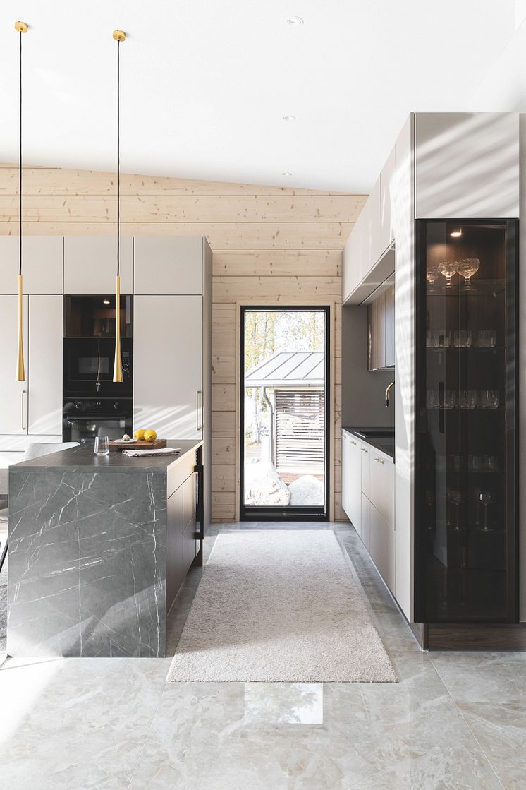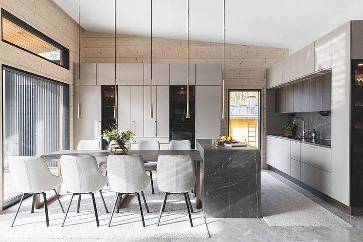 Villa Honkaranta är inrett i mjuka toner där materialval och färger ger en exklusiv känsla. Köket är inrett med Variant- och Storyluckor i utförandena Cashmere respektive Valnut. Valnöten letar sig även in som beklädnad i skåp och vitrin för att ge en ombonad känsla och skapa ett djup.