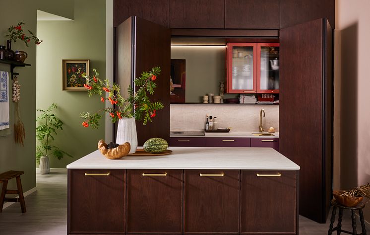 Årets inredningstrender visar en tydlig riktning mot varma, naturliga toner och taktila material. Olivgrönt och skogsgrönt skapar en känsla av lugn och en stark koppling till naturen. Som i bilden ovan med ett kök inrett med färgen "Rosemary", en klassisk björklucka. Vidare finner man milda jordtoner i brunt och beige, som ger en tidlös och harmonisk bas. Väljer man i stället dämpat orangeröd ton förmedlas en varm och inbjudande känsla. En färg som blir en naturlig del av ett modernt och hållbart kök. Likt Trendköket 2025, avbildat nedan.