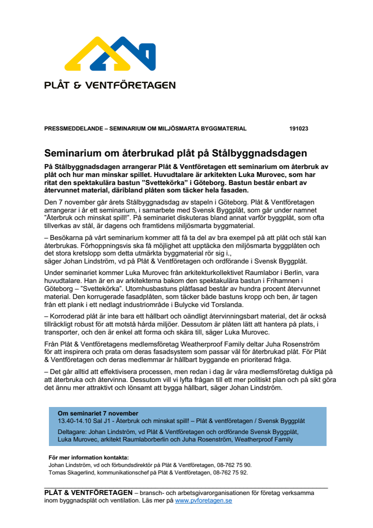Den 7 november går årets Stålbyggnadsdag av stapeln i Göteborg. Plåt & Ventföretagen arrangerar i år ett seminarium, i samarbete med Svensk Byggplåt, som går under namnet ”Återbruk och minskat spill!”. På seminariet diskuteras bland annat varför byggplåt är dagens och framtidens miljösmarta byggmaterial.
