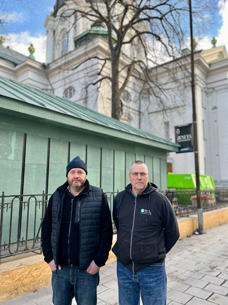 Bång & Lewerths vd Marcus Bäck tillsammans med Bob Blomqvist, framför miljöbyggnaden vid Gustaf Vasa Kyrka.