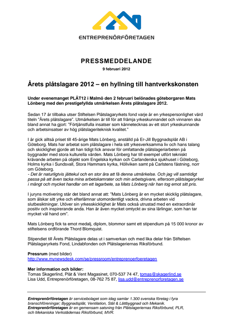 Tomas Skagerlind, Plåt & Vent Magasinet, 070-537 74 47, tomas@skagerlind.se