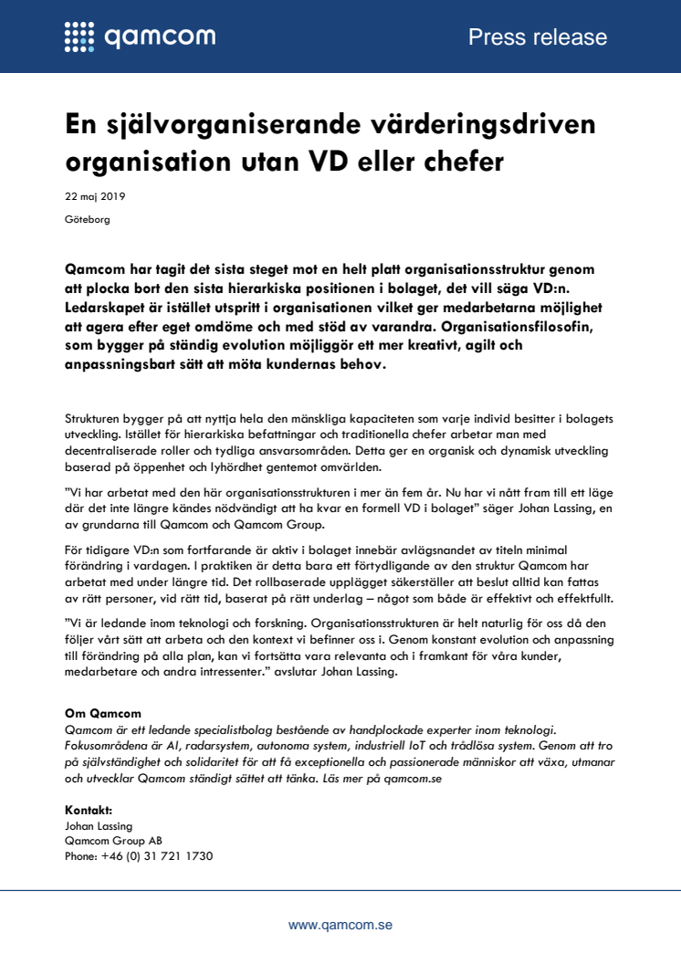 Qamcom har tagit det sista steget mot en helt platt organisationsstruktur genom att plocka bort den sista hierarkiska positionen i bolaget, det vill säga VD:n. Ledarskapet är istället utspritt i organisationen vilket ger medarbetarna möjlighet att agera efter eget omdöme och med stöd av varandra.