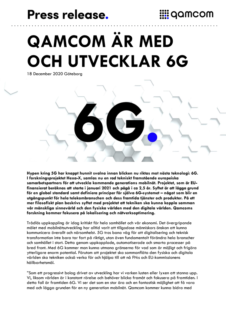 Hypen kring 5G har knappt hunnit svalna innan blicken nu riktas mot nästa teknologi: 6G. I forskningsprojektet Hexa-X, samlas nu en rad tekniskt framstående europeiska samarbetspartners för att utveckla kommande generations mobilnät. Syftet är att koppla samman vår mänskliga sinnevärld och den fysiska världen med den digitala världen. Qamcom kommer fokusera på lokalisering och nätverksoptimering.