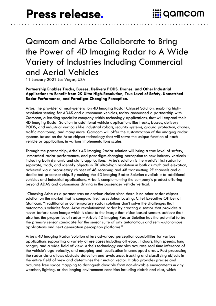 Qamcom and Arbe Collaborate to Bring the Power of 4D Imaging Radar to A Wide Variety of Industries Including Commercial and Aerial Vehicles