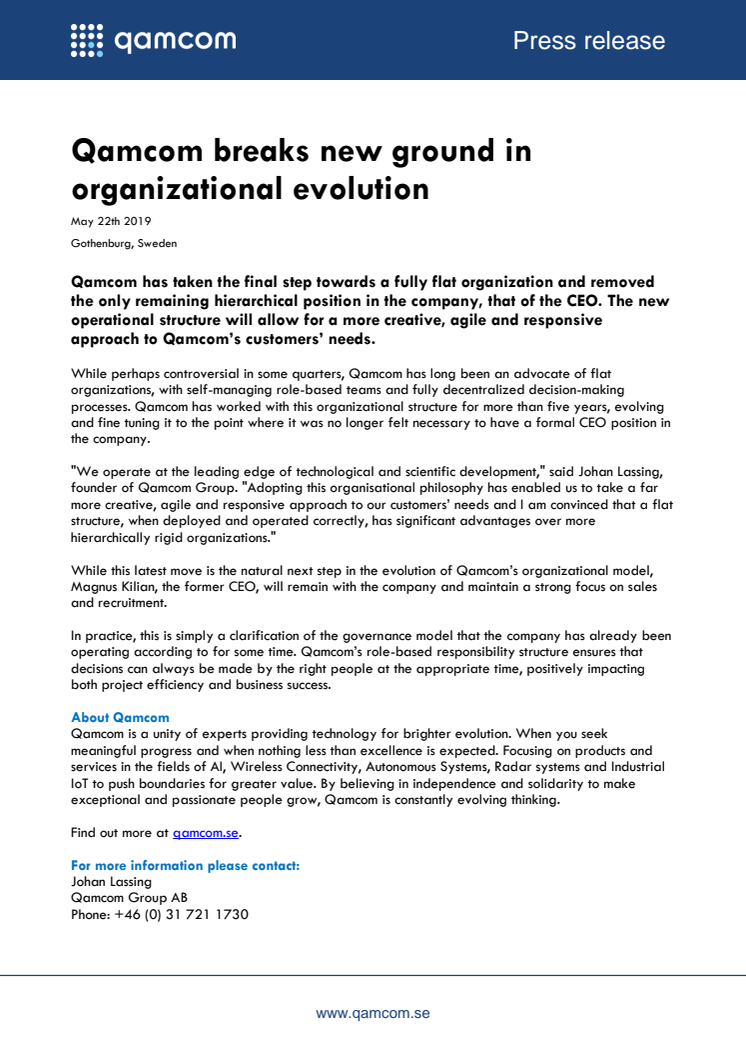 Qamcom has taken the final step towards a fully flat organization and removed the only remaining hierarchical position in the company, that of the CEO. The new operational structure will allow for a more creative, agile and responsive approach to Qamcom’s customers’ needs.