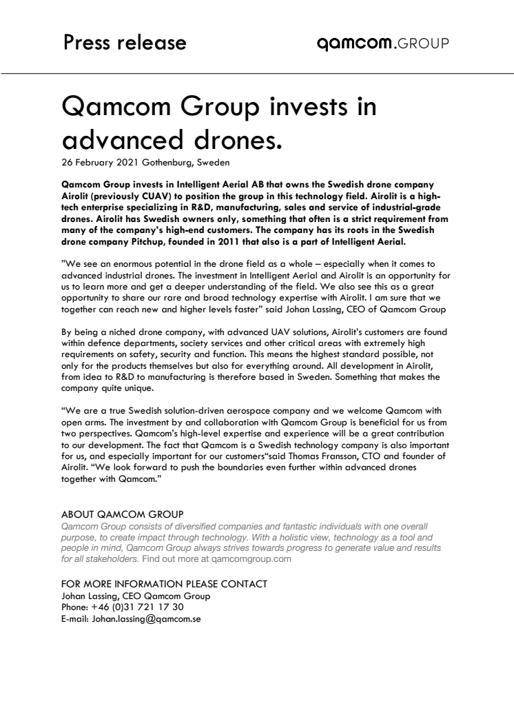 Qamcom Group invests in Intelligent Aerial AB that owns the Swedish drone company Airolit (previously CUAV) to position the group in this technology field. Airolit is a high-tech enterprise specializing in R&D, manufacturing, sales and service of industrial-grade drones. Airolit has Swedish owners only, something that often is a strict requirement from many of the company’s high-end customers.