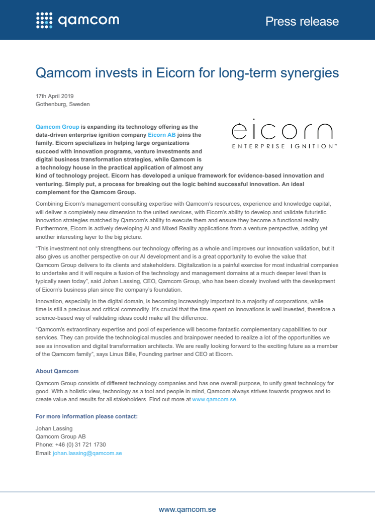 Qamcom Group is expanding its technology offering as the data-driven enterprise ignition company Eicorn AB joins the family. Eicorn specializes in helping large organizations succeed with innovation programs, venture investments and digital business transformation strategies, while Qamcom is a technology house in the practical application of almost any kind of technology project.