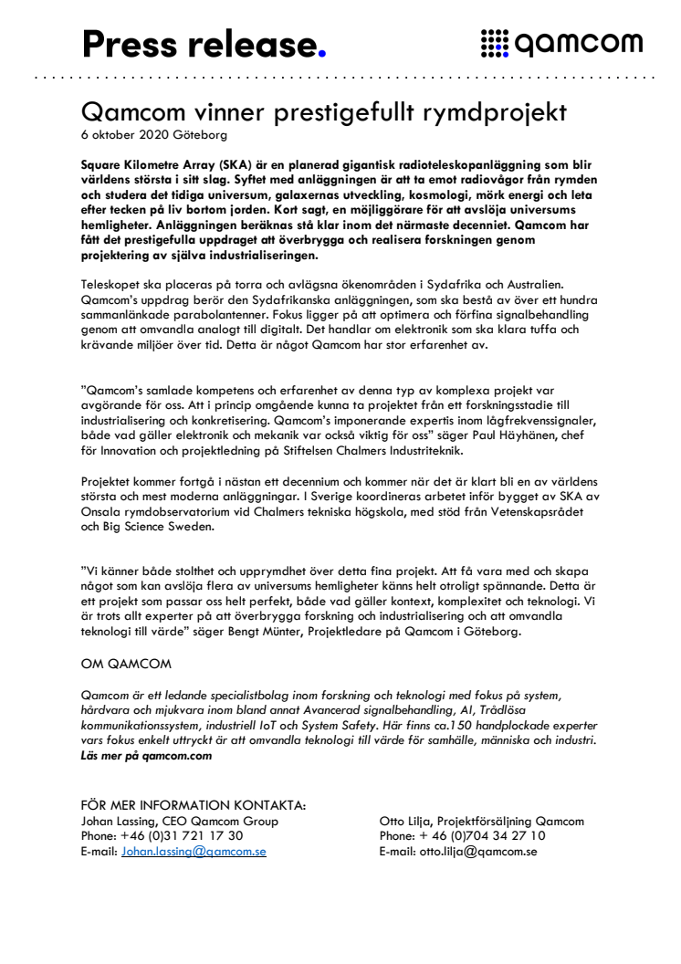 Square Kilometre Array (SKA) är en planerad gigantisk radioteleskopanläggning som blir världens största i sitt slag. Syftet med anläggningen är att studera det tidiga universum, galaxernas utveckling, kosmologi, mörk energi och leta efter utomjordiskt liv. Qamcom har fått det prestigefulla uppdraget att överbrygga och realisera forskningen genom projektering av själva industrialiseringen.