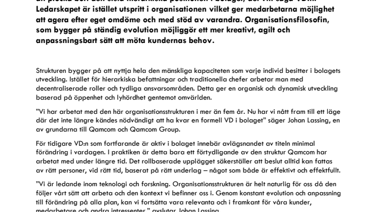 ”Vi har arbetat med den här organisationsstrukturen i mer än fem år. Nu har vi nått fram till ett läge där det inte längre kändes nödvändigt att ha kvar en formell VD i bolaget” säger Johan Lassing, en av grundarna till Qamcom och Qamcom Group.