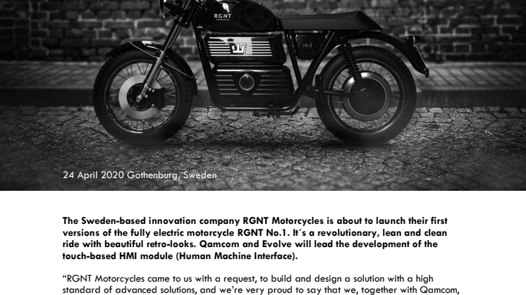 The Sweden-based innovation company RGNT Motorcycles is about to launch their first versions of the fully electric motorcycle RGNT No.1. It´s a revolutionary, lean and clean ride with beautiful retro-looks. Qamcom and Evolve will lead the development of the touch-based HMI module (Human Machine Interface).