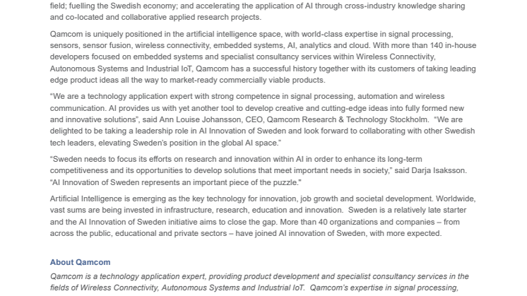“We are a technology application expert with strong competence in signal processing, automation and wireless communication. AI provides us with yet another tool to develop creative and cutting-edge ideas into fully formed new and innovative solutions”, said Ann Louise Johansson, CEO, Qamcom Research & Technology Stockholm. “We are delighted to be taking a leadership role in AI Innovation of Sweden and look forward to collaborating with other Swedish tech leaders, elevating Sweden’s position in the global AI space.”
