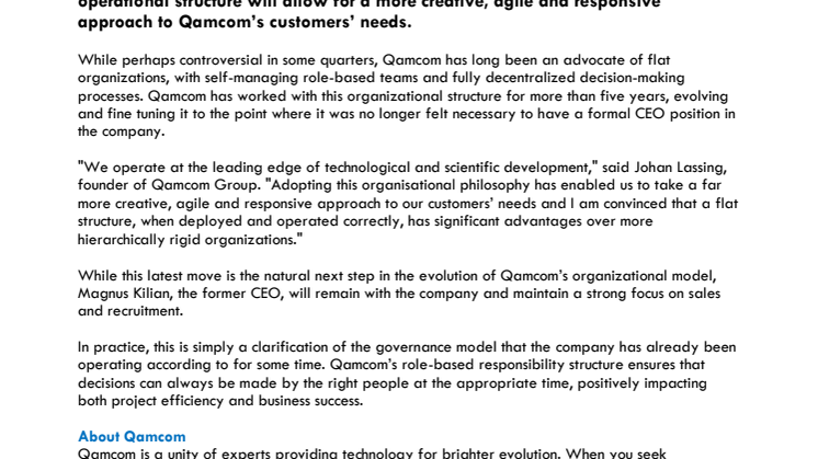 Qamcom has taken the final step towards a fully flat organization and removed the only remaining hierarchical position in the company, that of the CEO. The new operational structure will allow for a more creative, agile and responsive approach to Qamcom’s customers’ needs.