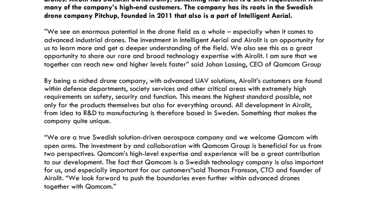 “We are a true Swedish solution-driven aerospace company and we welcome Qamcom with open arms. The investment by and collaboration with Qamcom Group is beneficial for us from two perspectives. Qamcom’s high-level expertise and experience will be a great contribution to our development. The fact that Qamcom is a Swedish technology company is also important for us, and especially important for our customers“said Thomas Fransson, CTO and founder of Airolit.“We look forward to push the boundaries even further within advanced drones together with Qamcom.”