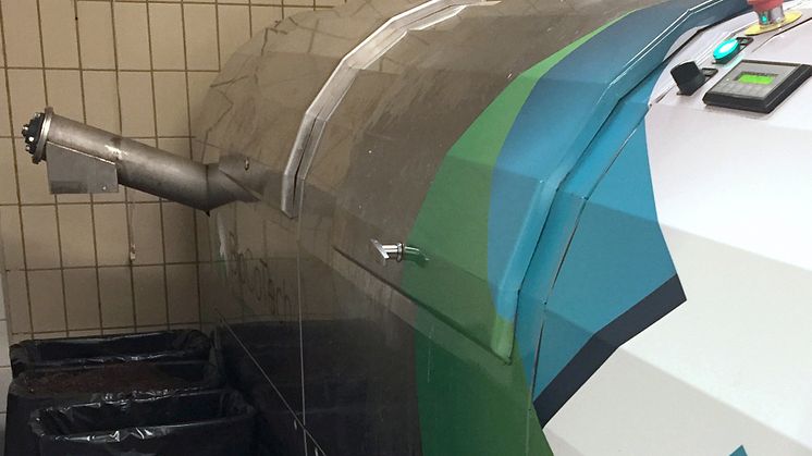 Kompostmaskinen är placerad i ett rum precis intill köket och efter dagens serveringar slänger personalen ner matavfallet i maskinen där en kvarn först maler innehållet för att sedan bearbeta och lufta det under ett par dagar, innan en jord/gödsel-blandning sedan kan plockas ut. Från avfall till bördig jord på bara några dagar alltså.