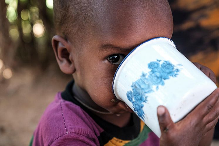 Abdi drinks a cup of milk ,five months after recovering from SAM, at their home, Ethiopia