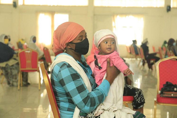Zenebech* mother of three with her youngest at an emergency food assistance gathering.