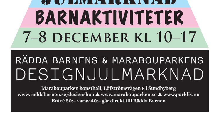 Succén fortsätter. För tredje året i rad startar Rädda Barnen och Marabouparken konsthall julfirandet tillsammans den 2:a advent. Designers och formgivare har bjudits in för att delta i en julmarknad som främjar barns rättigheter. Utöver utställarnas egna kreationer finns det även möjlighet att köpa produkter från Rädda Barnens designshop, Design för Barns Rättigheter.
