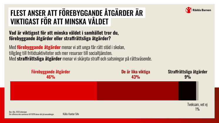 När förebyggande åtgärder som skola, socialtjänst och tillgång till fritidsaktiviteter ställs mot straffrättsliga åtgärder som skärpta straff och satsningar på rättsväsende, svarar 89 procent att förebyggande åtgärder är lika viktigt eller viktigare för att minska våldet i samhället, och endast 9 procent tror att straffrättsliga åtgärder är viktigast.