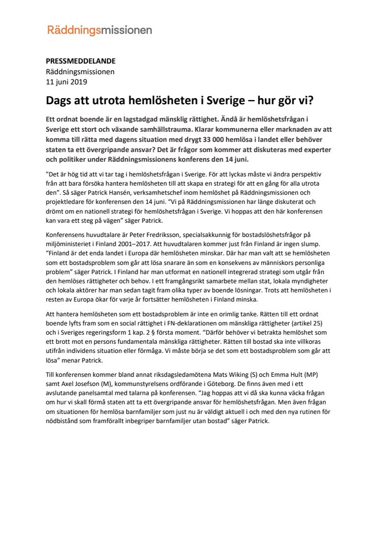 Ett ordnat boende är en lagstadgad mänsklig rättighet. Ändå är hemlöshetsfrågan i Sverige ett stort och växande samhällstrauma. Klarar kommunerna eller marknaden av att komma till rätta med dagens situation med drygt 33 000 hemlösa i landet eller behöver staten ta ett övergripande ansvar? Det är frågor som kommer att diskuteras under Räddningsmissionens konferens den 14 juni.