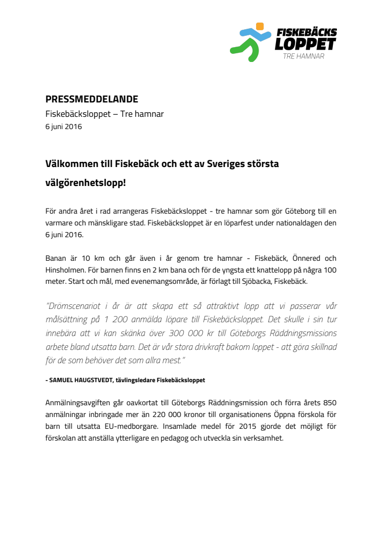 För andra året i rad arrangeras Fiskebäcksloppet - tre hamnar som gör Göteborg till en varmare och mänskligare stad. Fiskebäcksloppet är en löparfest under nationaldagen den 6 juni 2016.