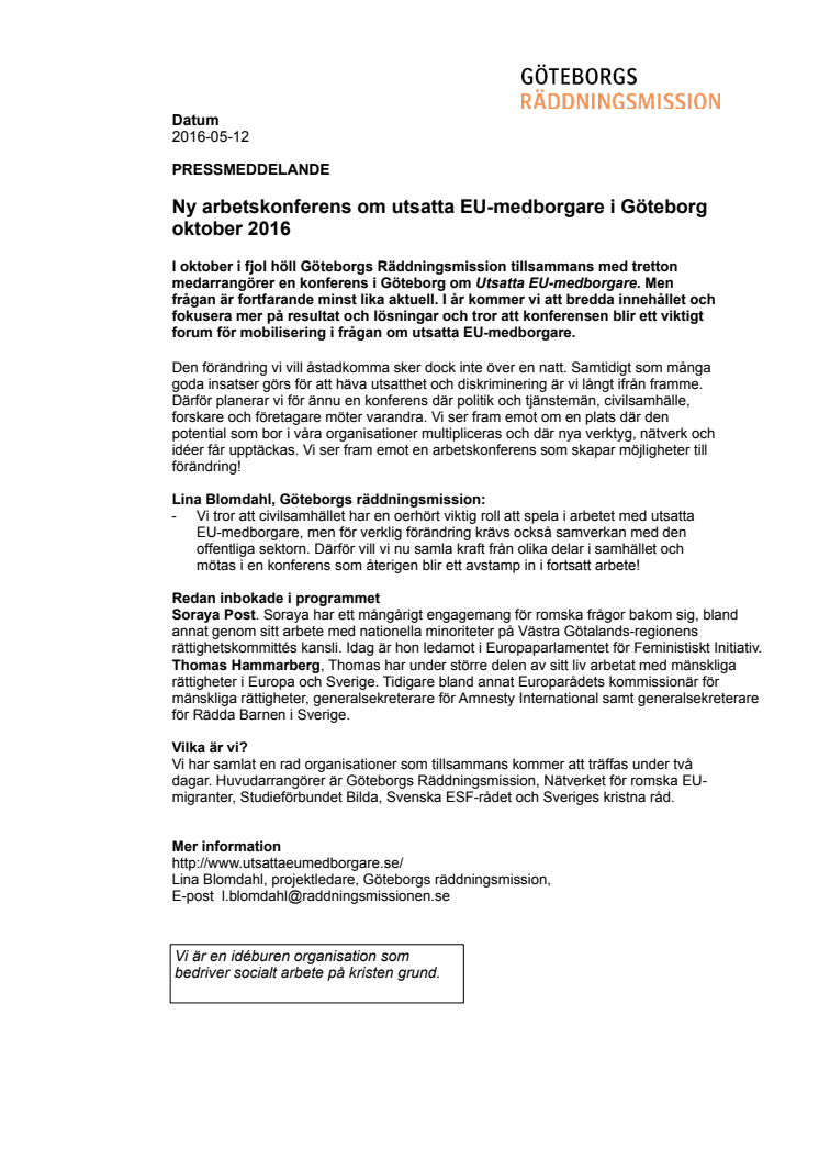 I oktober i fjol höll Göteborgs Räddningsmission tillsammans med tretton medarrangörer en konferens i Göteborg om Utsatta EU-medborgare. Men frågan är fortfarande minst lika aktuell. I år kommer vi att bredda innehållet och fokusera mer på resultat och lösningar och tror att konferensen blir ett viktigt forum för mobilisering i frågan om utsatta EU-medborgare.