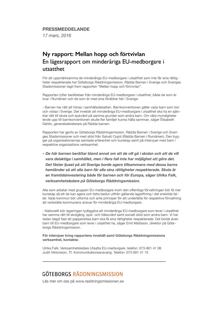För att uppmärksamma de minderåriga EU-medborgare i utsatthet som inte får sina rättigheter respekterare. har Rädda Barnen, Göteborgs Räddningsmission och Sveriges Stadsmissioner tagit fram rapporten ”Mellan hopp och förtvivlan”. Rapporten lyfter berättelser från minderåriga EU-medborgare i utsatthet, både de som är kvar i Rumänien och de som är med sina föräldrar här i Sverige.
