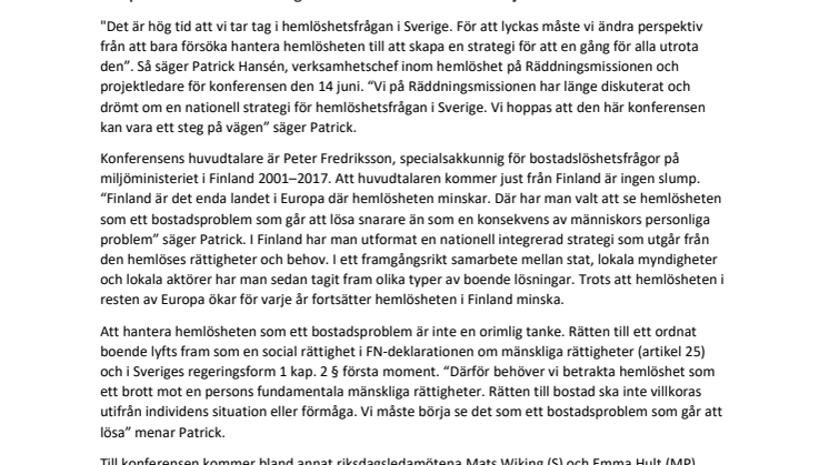 "Det är hög tid att vi tar tag i hemlöshetsfrågan i Sverige. För att lyckas måste vi ändra perspektiv från att bara försöka hantera hemlösheten till att skapa en strategi för att en gång för alla utrota den”. Så säger Patrick Hansén, verksamhetschef inom hemlöshet på Räddningsmissionen och projektledare för konferensen den 14 juni. “Vi på Räddningsmissionen har länge diskuterat och drömt om en nationell strategi för hemlöshetsfrågan i Sverige. Vi hoppas att den här konferensen kan vara ett steg på vägen” säger Patrick.