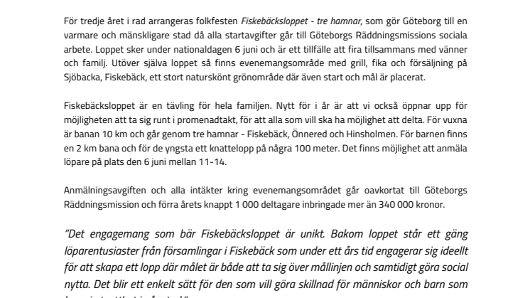 För tredje året i rad arrangeras folkfesten Fiskebäcksloppet - tre hamnar, som gör Göteborg till en varmare och mänskligare stad då alla startavgifter går till Göteborgs Räddningsmissions sociala arbete. Loppet sker under nationaldagen 6 juni och är ett tillfälle att fira tillsammans med vänner och familj. Utöver själva loppet så finns evenemangsområde med grill, fika och försäljning på Sjöbacka, Fiskebäck, ett stort naturskönt grönområde där även start och mål är placerat.