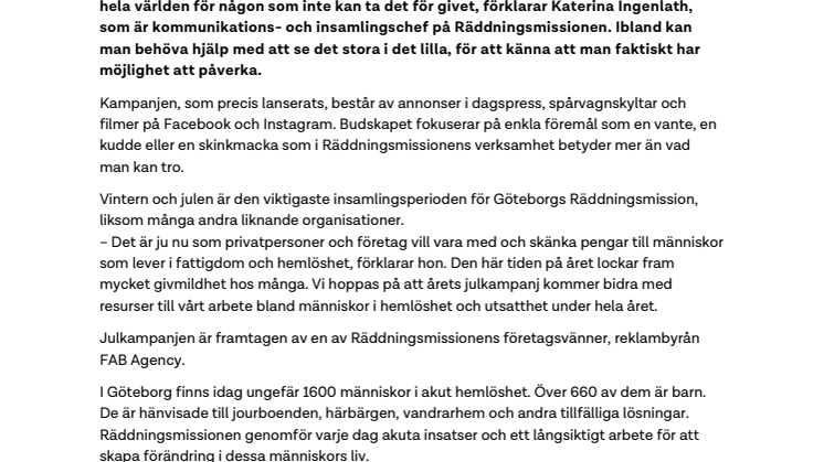 Kampanjen, som precis lanserats, består av annonser i dagspress, spårvagnskyltar och filmer på Facebook och Instagram. Budskapet fokuserar på enkla föremål som en vante, en kudde eller en skinkmacka som i Räddningsmissionens verksamhet betyder mer än vad man kan tro.