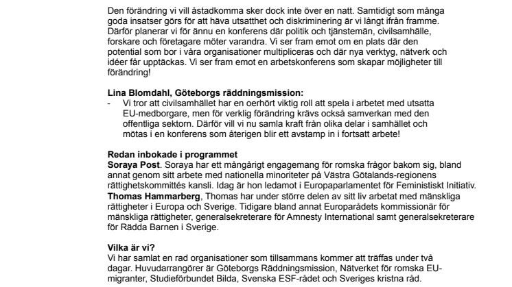 Vi har samlat en rad organisationer som tillsammans kommer att träffas under två dagar. Huvudarrangörer är Göteborgs Räddningsmission, Nätverket för romska EU-migranter, Studieförbundet Bilda, Svenska ESF-rådet och Sveriges kristna råd.