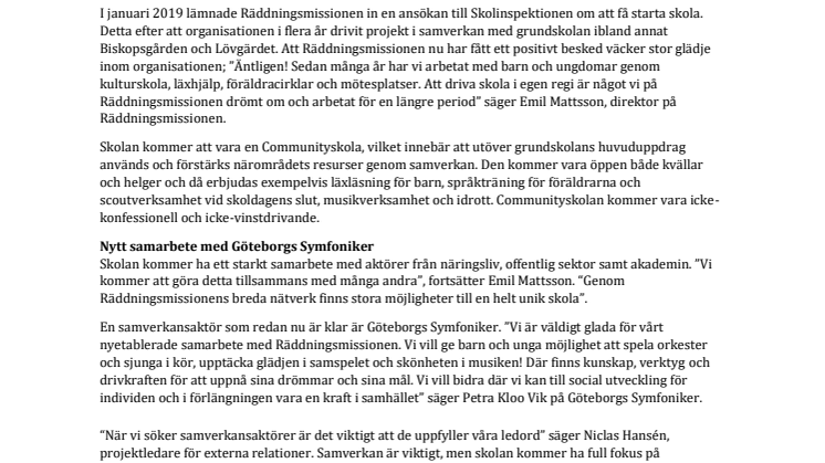 Igår 26 september kom beskedet att Räddningsmissionen har blivit beviljade tillstånd av Skolinspektionen att starta en grundskola F-9. Trots att Skolinspektionen i år godkände färre ansökningar än vanligt är Räddningsmissionens Communityskola en av få aktörer som fått tillstånd att starta hösten 2020. Nu sätter arbetet igång på riktigt med att förbereda för skolstart. En redan klar samverkansaktör är Göteborgs Symfoniker.