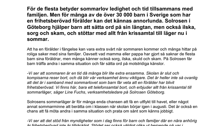 -Vi ser att sommaren är en tid då många blir lite extra ensamma. Skolan är slut och kompisarna reser bort, och då blir vår verksamhet ännu viktigare. Det är heller inte så ovanlig att det är i samband med sommarlovet som barn får veta att en förälder har blivit frihetsberövad. Vi finns här, bara ett telefonsamtal bort, och erbjuder allt från krissamtal till sommarläger, säger Line Fuchs, verksamhetsledare på Solrosen Göteborg.