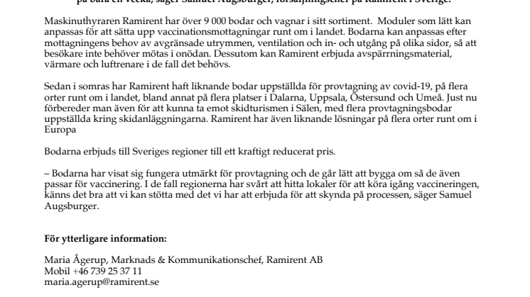 Maskinuthyraren Ramirent har över 9 000 bodar och vagnar i sitt sortiment. Moduler som lätt kan anpassas för att sätta upp vaccinationsmottagningar runt om i landet. Bodarna kan anpassas efter mottagningens behov av avgränsade utrymmen, ventilation och in- och utgång på olika sidor, så att besökare inte behöver mötas i onödan. Dessutom kan Ramirent erbjuda avspärrningsmaterial, värmare och luftrenare i de fall det behövs.