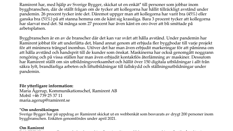 Ramirent har, med hjälp av Sverige Bygger, skickat ut en enkät* till personer som jobbar inom byggbranschen, där de ställt frågan om de tycker att kollegorna har hållit tillräckligt avstånd under pandemin. 26 procent tycker inte det. Däremot uppger man att kollegorna har varit bra (45%) eller ganska bra (51%) på att stanna hemma om de känt sig krassliga. Bara 3 procent tycker att kollegorna har slarvat med det. Så många som 27 procent har även känt en oro över att bli smittade på arbetsplatsen.
