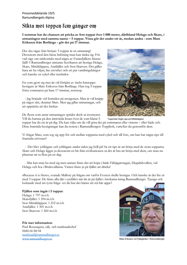 I sommar har du chansen att pricka av fem toppar över 1 000 meter, däribland Helags och Skars, i utmaningen med samma namn – 5 toppar. Vissa gör det under ett år, medan andra - som Mats Eriksson från Borlänge - gör det på 17 timmar.