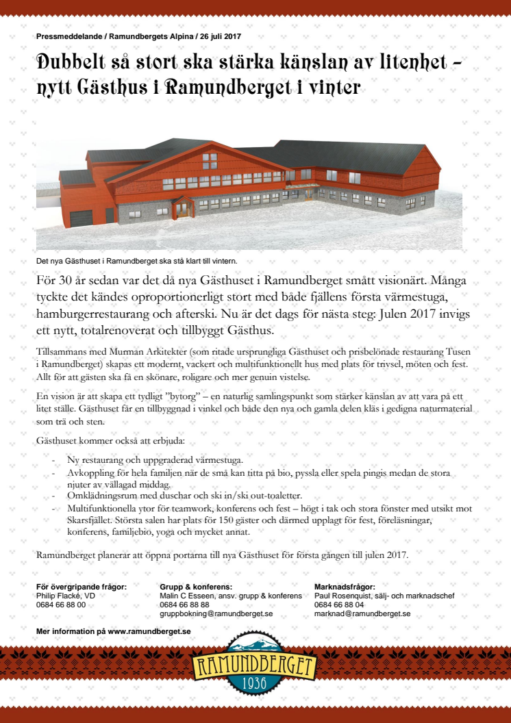 För 30 år sedan var det då nya Gästhuset i Ramundberget smått visionärt. Många tyckte det kändes oproportionerligt stort med både fjällens första värmestuga, hamburgerrestaurang och afterski. Nu är det dags för nästa steg: Julen 2017 invigs ett nytt, totalrenoverat och tillbyggt Gästhus.