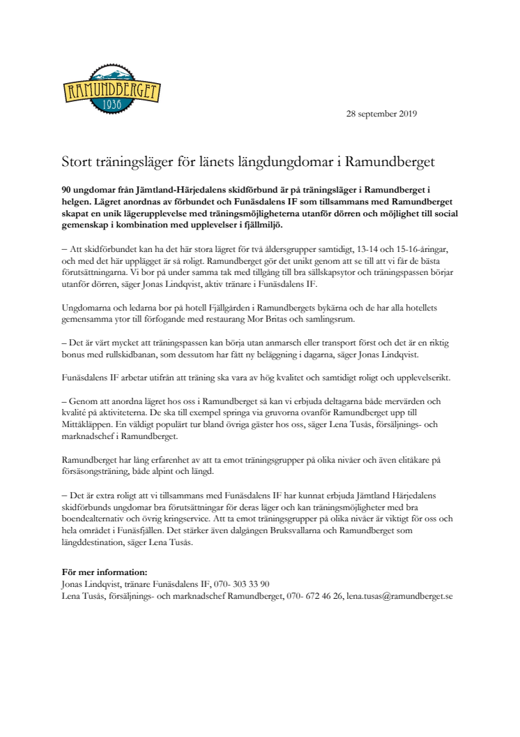 90 ungdomar från Jämtland-Härjedalens skidförbund är på träningsläger i Ramundberget. Lägret anordnas av förbundet och Funäsdalens IF. Alla bor under samma tak, träningspassen kan börja direkt utanför dörren, det finns tillgång till en rullskidbana som i dagarna fått ny beläggning och mervärde skapas genom upplevelser i fjällmiljön.