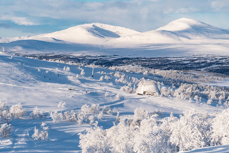 Vinter på Ramundberget med Skarsfjället i bakgrunden och restaurang Tusen till höger i bild.