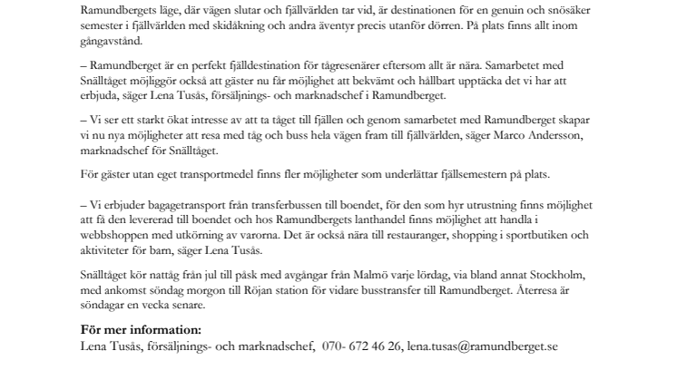 – Vi ser ett starkt ökat intresse av att ta tåget till fjällen och genom samarbetet med Ramundberget skapar vi nu nya möjligheter att resa med tåg och buss hela vägen fram till fjällvärlden, säger Marco Andersson, marknadschef för Snälltåget.