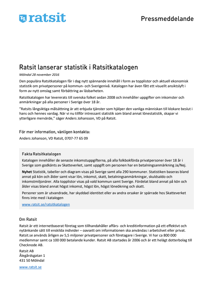 Den populära Ratsitkatalogen får i dag nytt spännande innehåll i form av topplistor och aktuell ekonomisk statistik om privatpersoner på kommun- och Sverigenivå. Ratsitkatalogen har levererats till svenska folket sedan 2008 och innehåller uppgifter om inkomster och anmärkningar på alla personer i Sverige över 18 år.