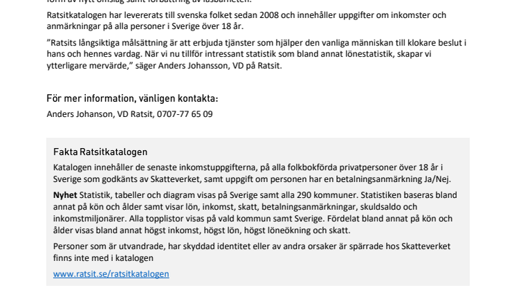 Den populära Ratsitkatalogen får i dag nytt spännande innehåll i form av topplistor och aktuell ekonomisk statistik om privatpersoner på kommun- och Sverigenivå. Katalogen har även fått ett visuellt ansiktslyft i form av nytt omslag samt förbättring av läsbarheten.