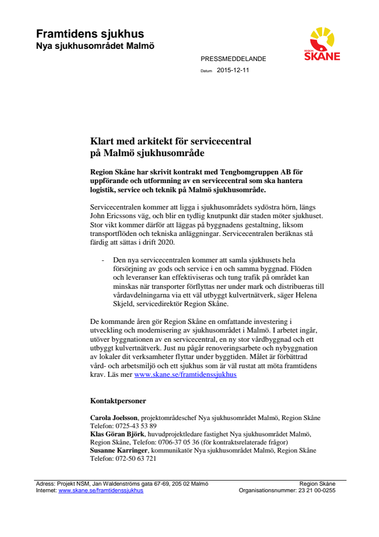 Region Skåne har skrivit kontrakt med Tengbomgruppen AB för uppförande och utformning av en servicecentral som ska hantera logistik, service och teknik på Malmö sjukhusområde.