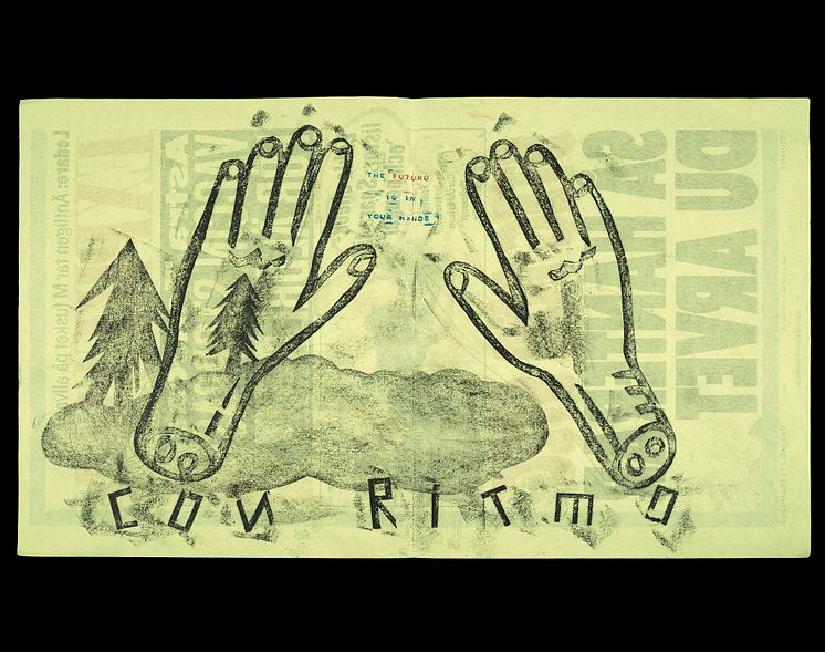 Målning av Nacho Tatjer på baksidan av en tidningslöpsedel. med texten Con Ritmo. Kan ses på Mariatorgets tunnelbanestation i Konstväxlingar från september 2024 till september 2025.