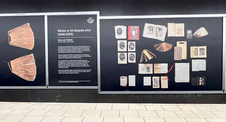 Marja-Leenas Sillanpääs utställning Böcker ur ett växande arkiv (1968-2024) på Slussens tunnelbanestation visas september 2024 till september 2025.