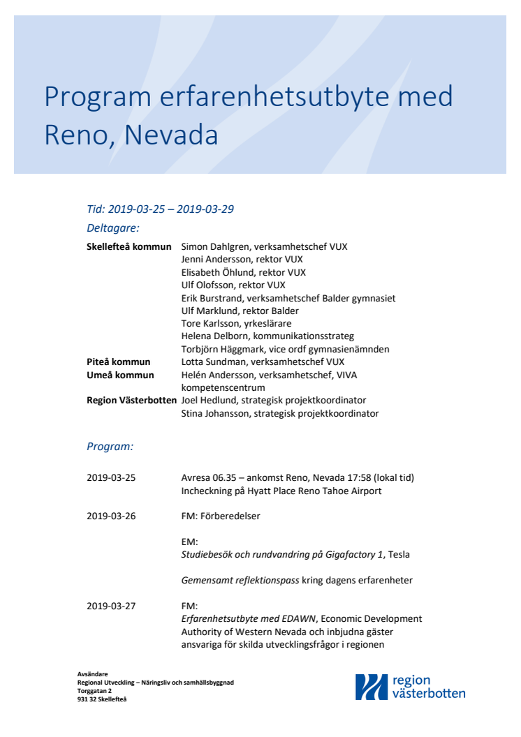 Region Västerbotten besöker tillsammans med företrädare från kommunala utbildningssektorn i Skellefteå, Piteå och Umeå kommun Reno i Nevada, för att dra nytta av regionens lärdomar kring större industrietableringar. 13personer deltar på resan, där fokus ligger på etableringsförfarande och utbildningsfrågor.