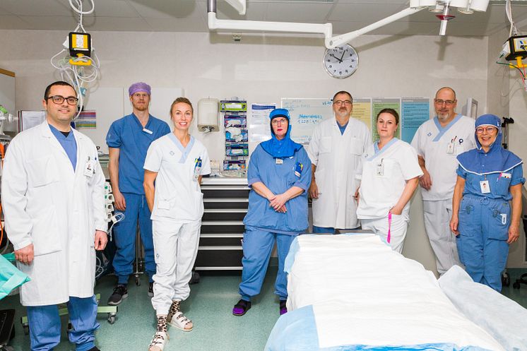 Från vänster: Roberto Valente, gastroenterolog, Robin Andersson, anestesisjuksköterska, Elin Christiansen, endoskopiundersjuksköterska, Annika Fahlstedt, operationsundersjuksköterska, Urban Arnelo, verksamhetschef, Kristin Rudberg, endoskopiundersjuksköterska, Jan-Erik Karlsson, endoskopisjuksköterska och Ann Sofie Ryd, narkosläkare.