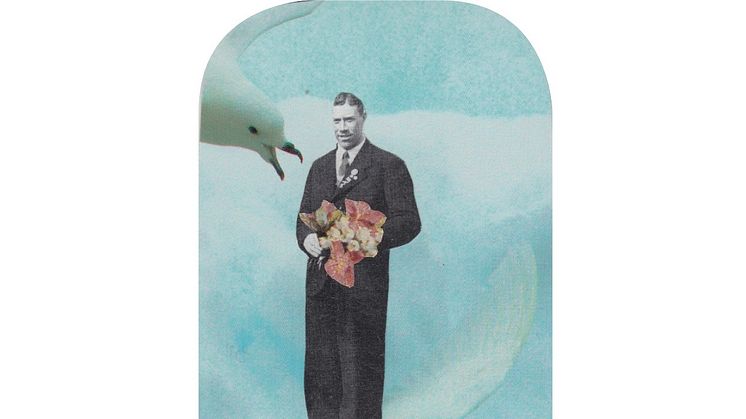 Malin Nilsson berättar: Projektet med de små collagen som ryms på botten av en ask makrill startade under en period av stressiga luncher där mina ögon vandrade mellan en ask makrill, en hårdbrödmacka och min mobil som flödade av bilder från sociala medier. Det blev en slags rörelse och förhoppning om att upptäcka bilder även i botten av asken (om jag tittade riktigt snabbt). Naturligtvis blev det inte så, men jag började tillverka collage i miniformat, 5 x 9 cm med rundade hörn. Storleken på bilderna gör att de är lätta att bära med i fickan eller i handväskan. Bilderna följer med mig ut i världen där jag hittar nya platser eller sammanhang. För det mesta fotar jag den nya ”bilden” eller händelsen som uppstår, men det händer även att jag lämnar collage på olika platser för att upptäckas av någon förbipasserande. Som en liten överraskning. Ibland skickar jag med collage när nära och kära åker iväg på resor för att se vad som händer när andra får hitta nya platser.